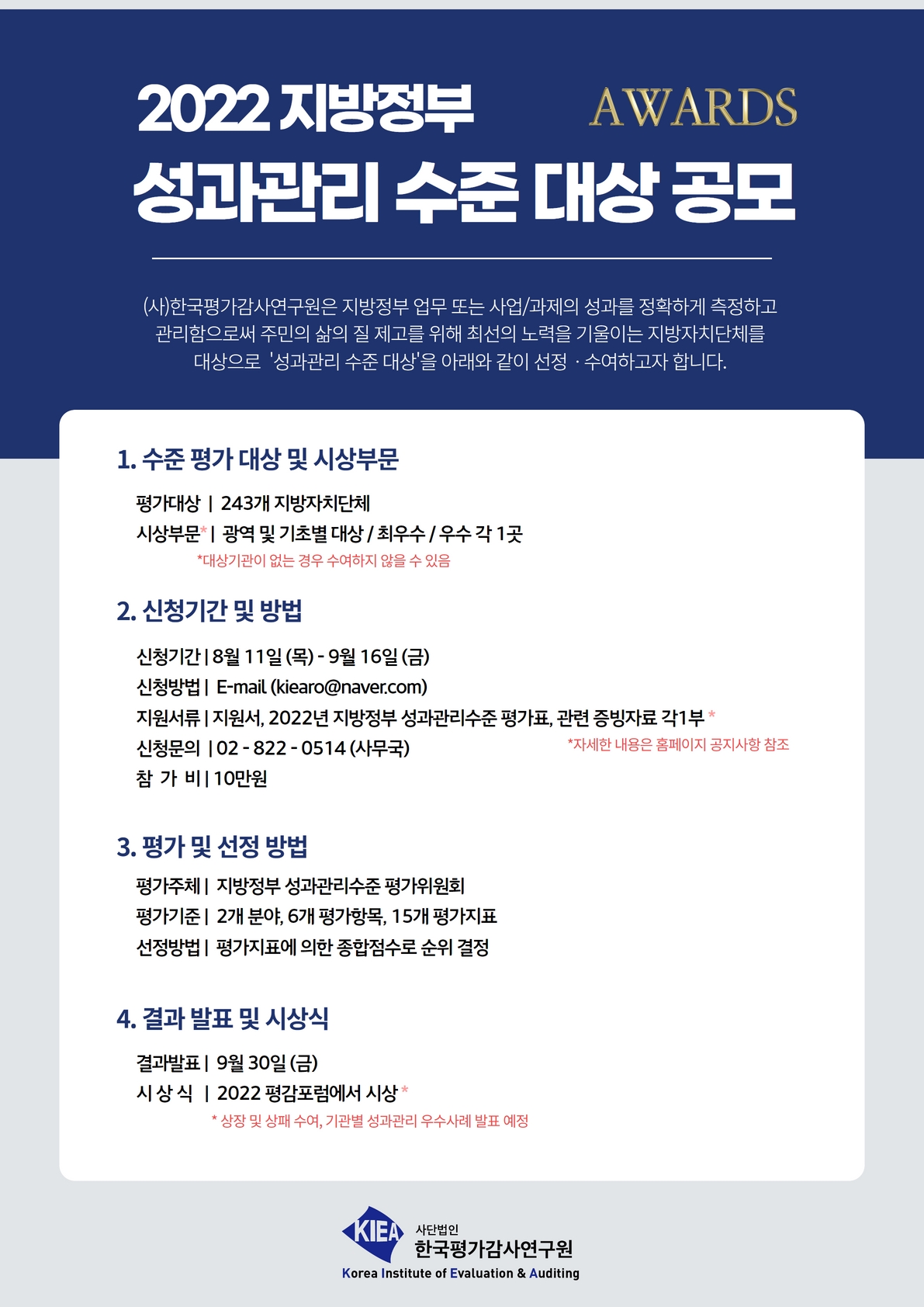 (사)한국평가감사연구원은 지방정부 업무 또는 사업/과제의 성과를 정확하게 측정하고 관리함으로써 주민의 삶의 질 제고를 위해 최선의 노력을 기울이는 지방자치단체를 대상으로 ‘성과관리 수준 대상’을 아래와 같이 선정ㆍ수여하고자 합니다. 자세한 내용은 아래와 같습니다.